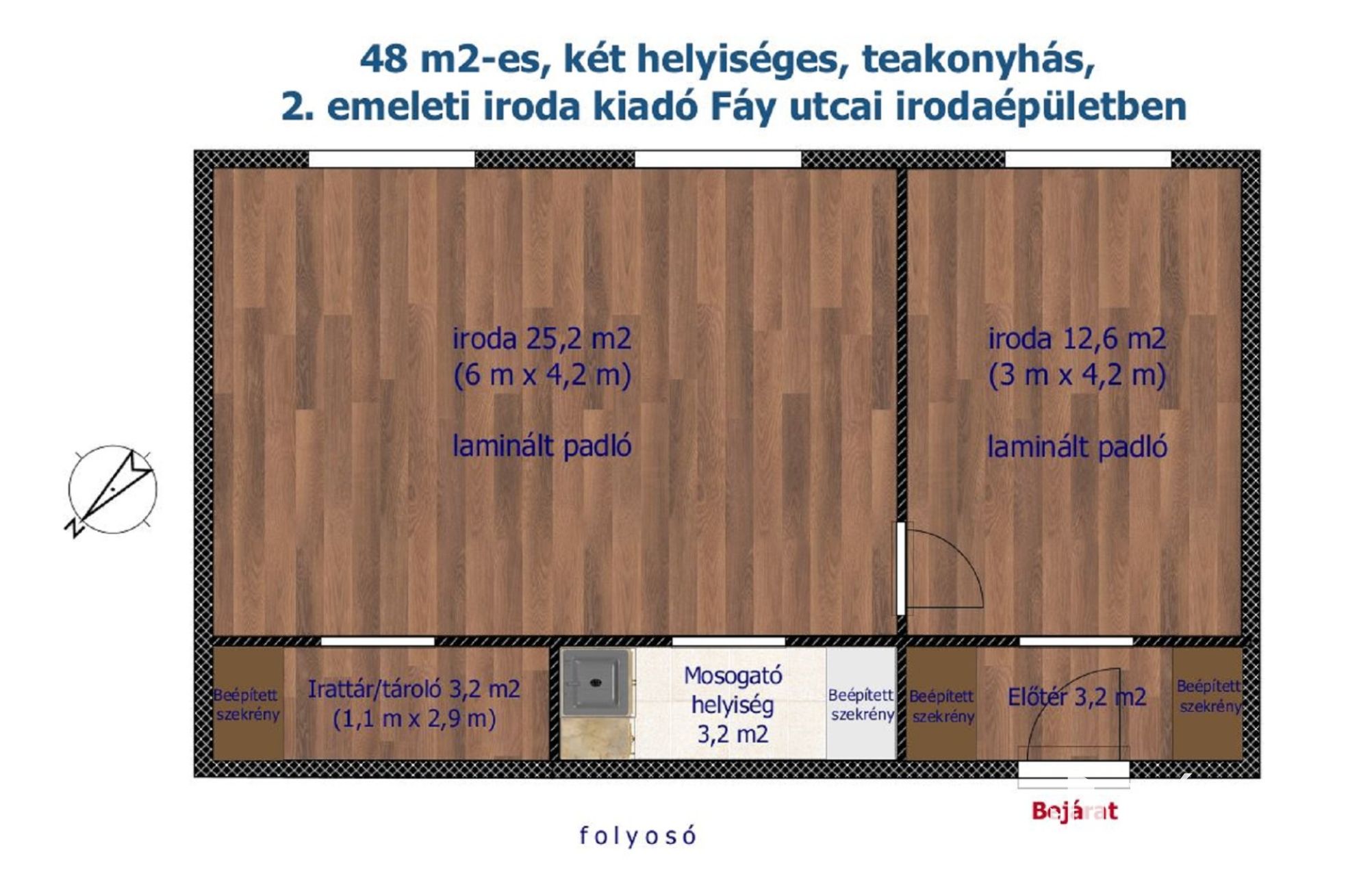 48 M2-ES, KÉT HELYISÉGES, TEAKONYHÁS, 2. EMELETI IRODA KIADÓ FÁY UTCAI IRODAÉPÜLETBEN