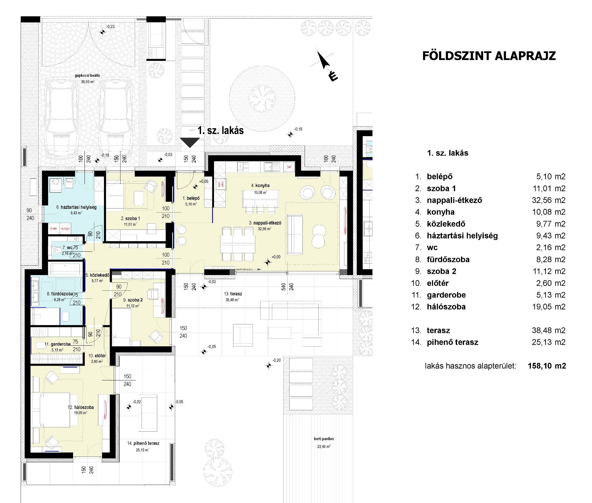 A földszintes, remek elrendezésű, ideális -DNY-i- tájolású nappali+3 hálószobás lakás nettó hasznos lakóterülete 126,29 m2, melyhez összesen 63,61m2 terasz és egy 39 m2 alapterületű dupla gépkocsibeálló tartozik, 585 m2 önálló saját telekrészzel.