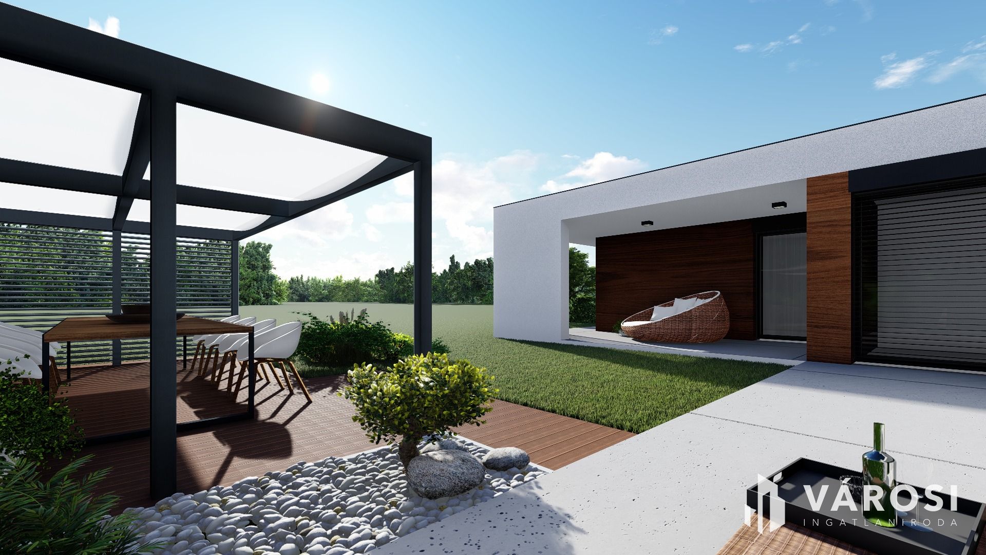 A nagyméretű, déli fekvésű terasz, valamint a hálószobából nyíló pihenőterasz is az önálló kertrészre néz.