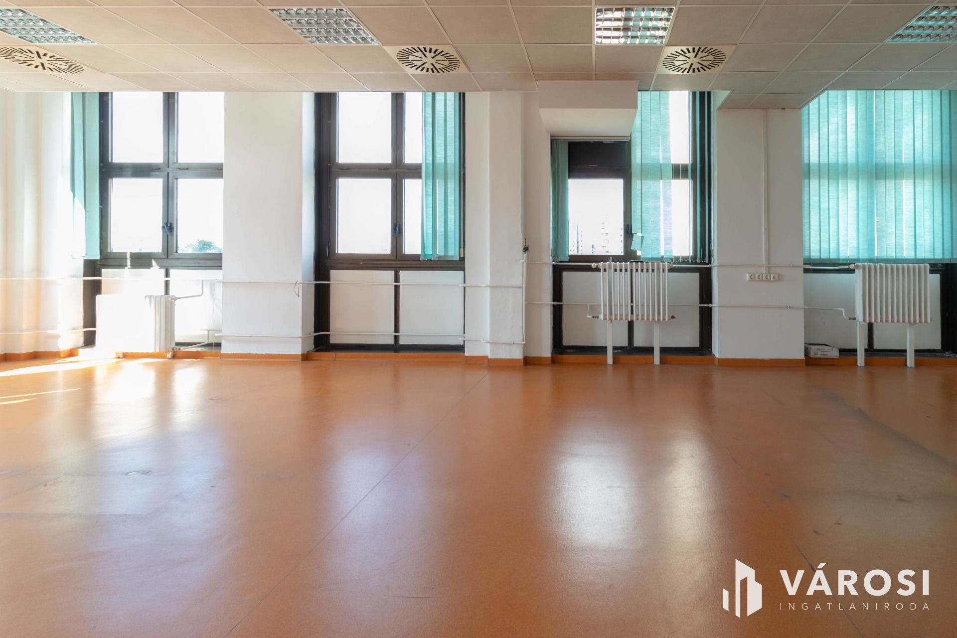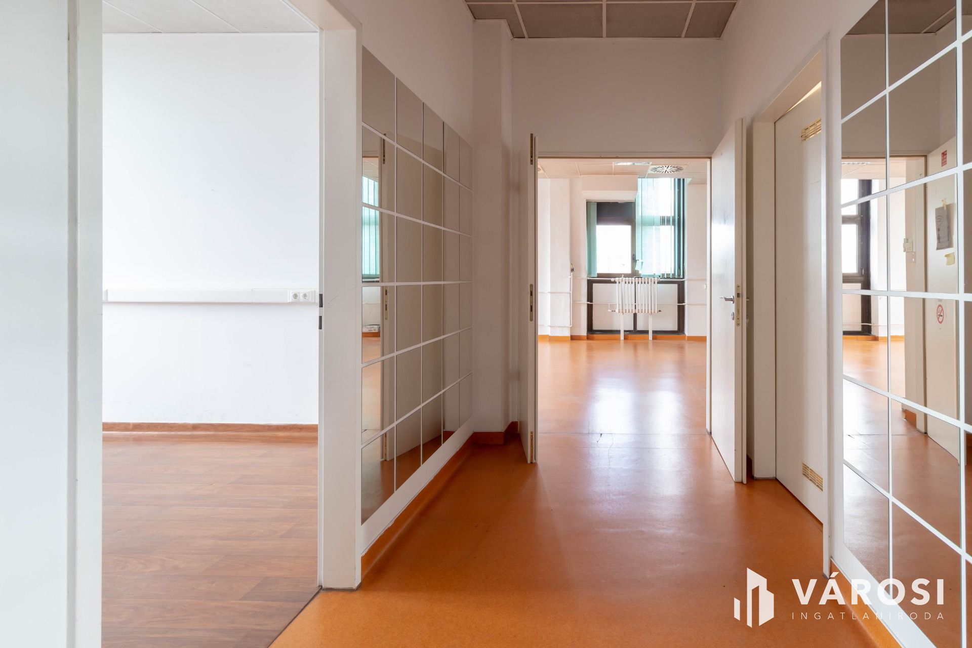 A 2. emeleten található, belső vizesblokkal rendelkező, 132 m2-es ingatlanrészben van egy 77 m2-es nagy terem, valamint két 17 m2-es iroda. A 8 m2-es előtérből nyílik mindegyik, valamint innen nyílik a 7 m2-es konyha is. A konyhából pedig az 5 m2-es mosdó, külön férfi és női wc-vel.