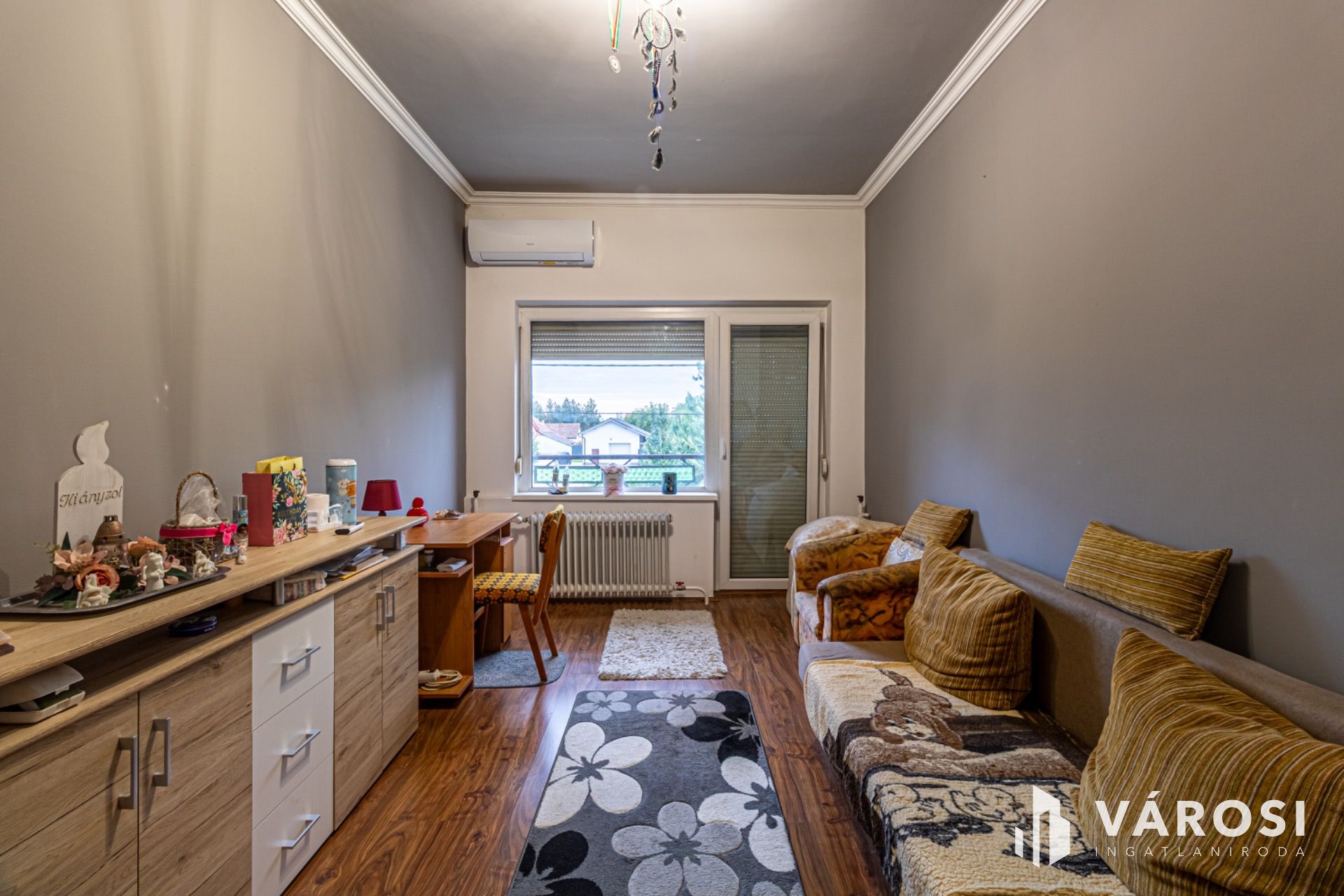 A nagyobb alapterületű lakrészben a földszinten egy tágas szobával, az emeleten három szobával rendelkezik, vegyes tüzelésű kazán+gázkazán fűtéssel, műanyag nyílászárókkal, redőnyökkel, valamint 2 hűtő-fűtő klímával.