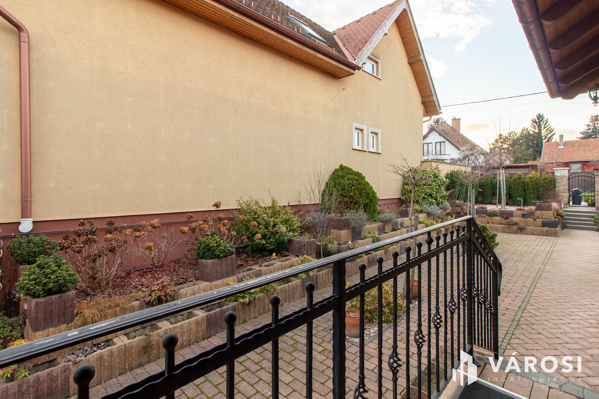A 800 m²-es telek igazi ékkő. Az előkert rendezett, térkövezett, örökzöldekkel díszített, automata öntözőrendszerrel ápolt. A hátsó kert viszont egy valódi privát oázis: zöld gyep, külön grillező- és sütögetőhely, hangulatos szaletli — tökéletes helyszín baráti estékhez, családi ünnepekhez vagy egy csendes borozáshoz egy hosszú nap végén. A nappaliból közvetlen teraszkapcsolat nyílik erre a kertre, így a belső és külső tér szinte egybeolvad.