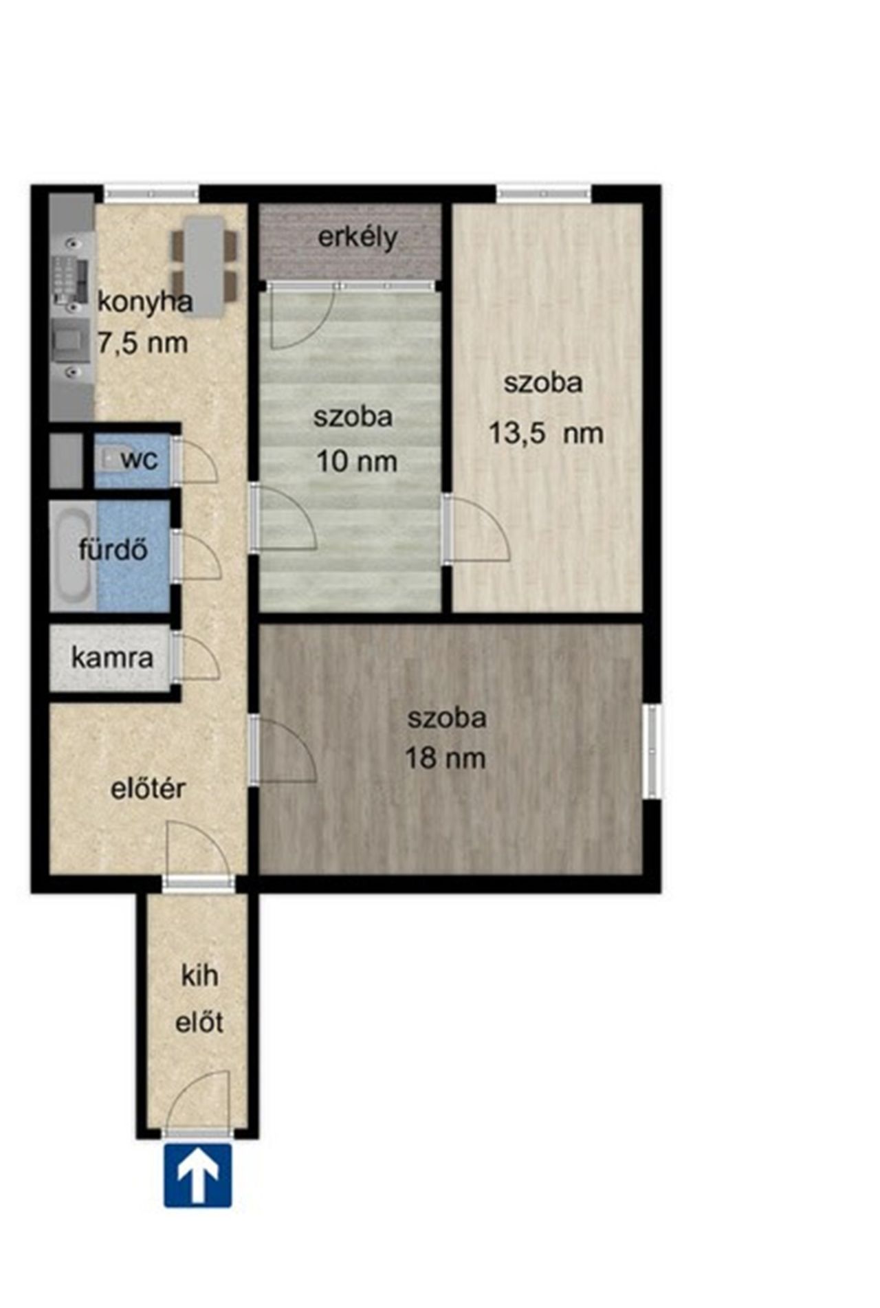 - 3 szoba, konyha, fürdő, WC, erkély, kamra, előtér.