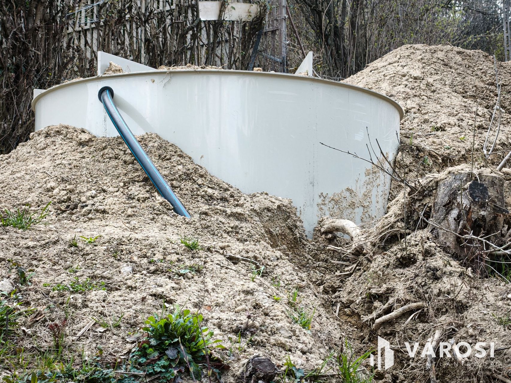 Szennyvíztartály beásva a földbe, csatorna kialakítva a házhoz.
