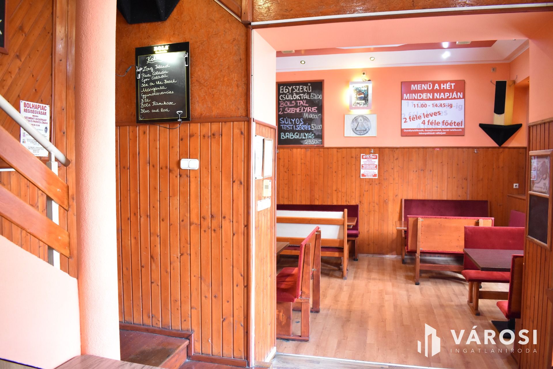 Az ingatlan földszinti részén lett kialakítva egy hangulatos és minden igényt kielégítő bárpult, egy éttermi vendéglátó rész, amely a kialakított szintén hangulatos galéria résszel közel 200 fő befogadásra alkalmas. A galéria rész ebből 104 fő befogadásra alkalmas, ahol a kialakításának köszönhetően zártkörű rendezvények lebonyolítására is tökéletesen alkalmas. A vendéglátó részen a közelmúltban lettek felújítva a vizesblokk (mosdó, WC) helységek is, amelyből 3 db. található az éttermi részen (férfi, női és mozgáskorlátozott). A vendéglátó egységhez tartozik egy hatalmas és modern eszközökkel felszerelt konyha, amely több részből áll, itt lett kialakítva egy pizza készítő, melegkonyha, előkészítő, mosogató, illetve több hűtő, raktár és mosdó helység is. A fűtésről 3 db gázkazán lapradiátorokkal, padlófűtéssel, a hűtésről klímaberendezések gondoskodnak. A vendéglátó részen az elektromos hálózat is korszerű, itt 3 x 72 A és ipari áram található.