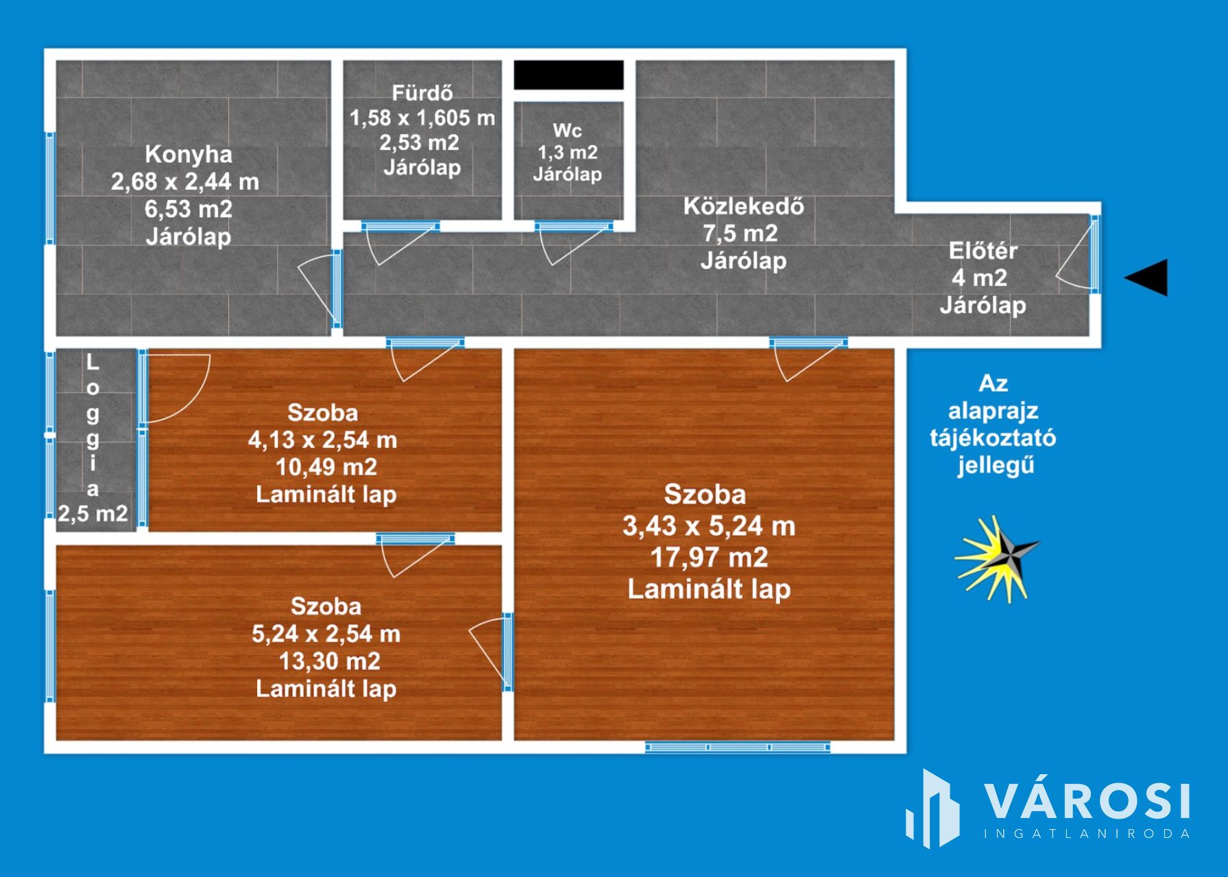 A lakás 1 db nappalival, 2 db hálószobával, 1 db fürdőszobával, külön Wc-vel, közlekedővel, előtéttel, loggiával rendelkezik. Az ingatlan elhelyezkedésre, kialakítása miatt rendkívül sokrétű a felhasználása - akár lakás, vagy befektetési célra -, amely maximálisan kiemeli ezt az ingatlant az átlagos lakások sorából és egyedülálló választássá teszi azt.