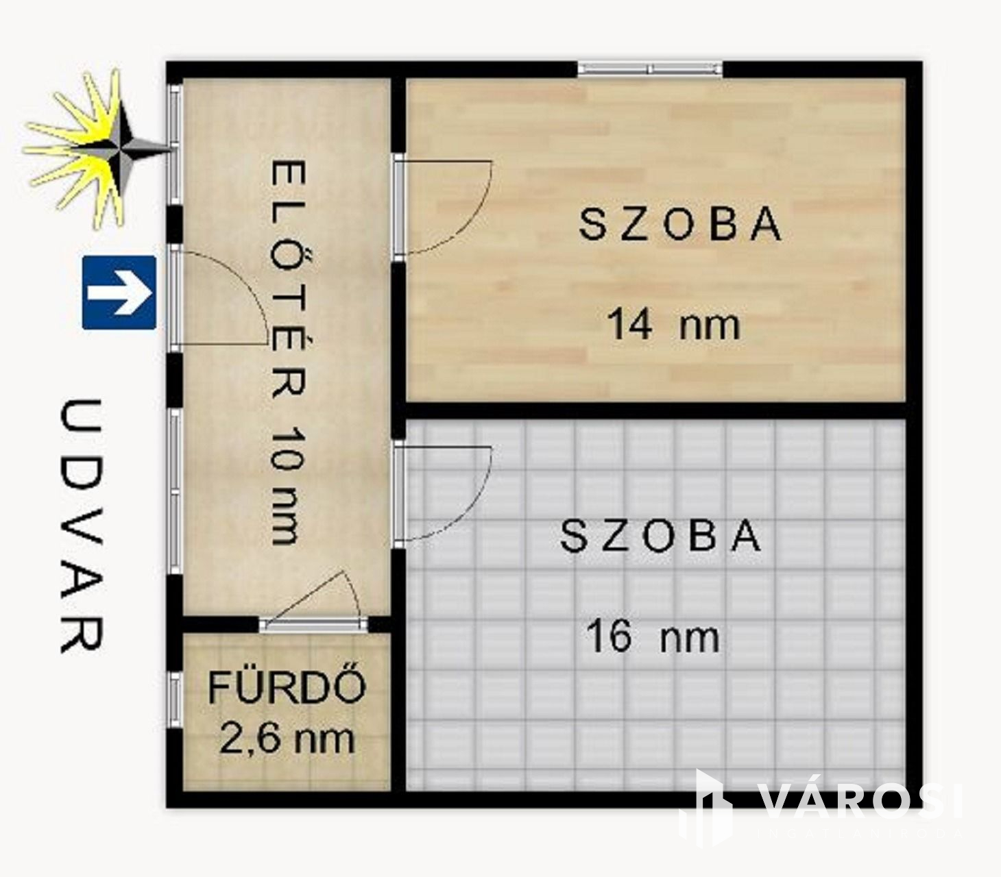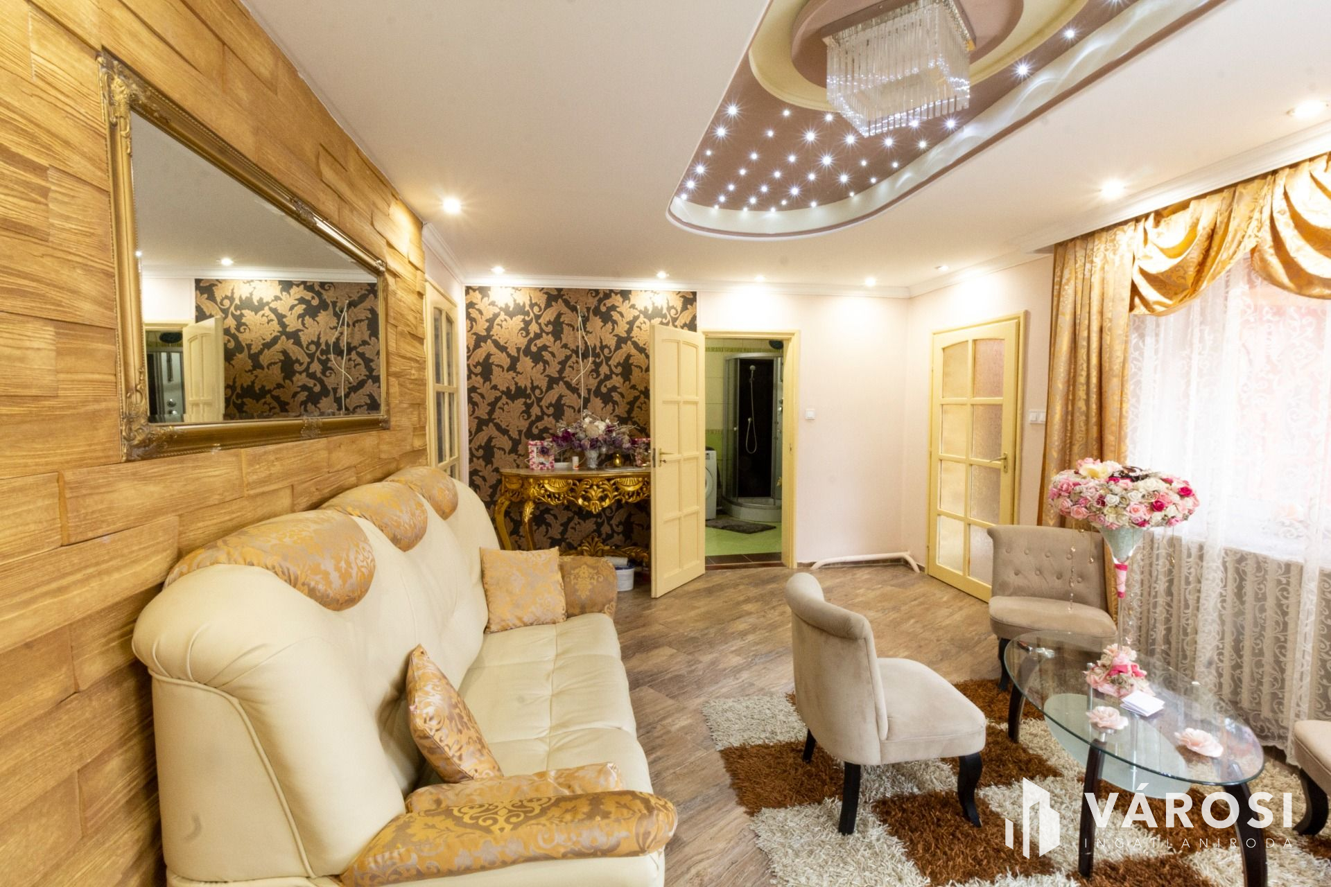 A lakásba belépve jobbra az amerikai konyhás étkező, balra pedig a nappali található, amelyből további két szoba nyílik. A szobák parkettások, a többi helyiség hidegburkolatú. Az L alakú ingatlan hátsó részében, külön bejáratú apartman lett kialakítva. Albérletnek kiadható lakrész.