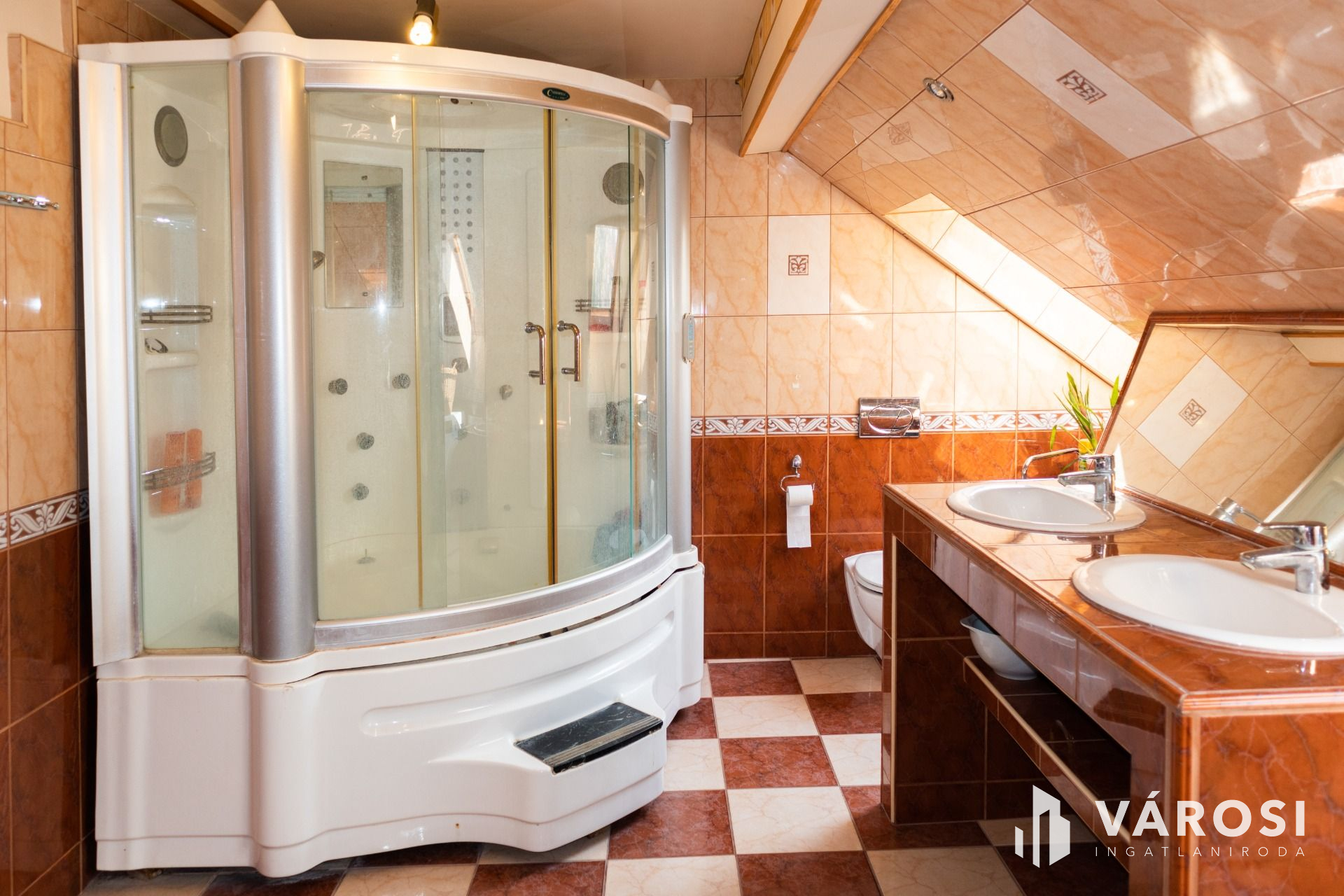 -164 m2 en 1 nappali+étkező,1 konyha, 6 szoba ahol 2 db 4 ágyas és 4 db 2 ágyas szoba kivitelezhető, 1 szauna, 2 fürdőszoba ahol az egyikben hidromasszázs zuhanykabin van elhelyezve beépített rádióval +2 wc és 1 gardróbszoba található. Összesítve 16-18 fő kényelmes altatása megoldható.