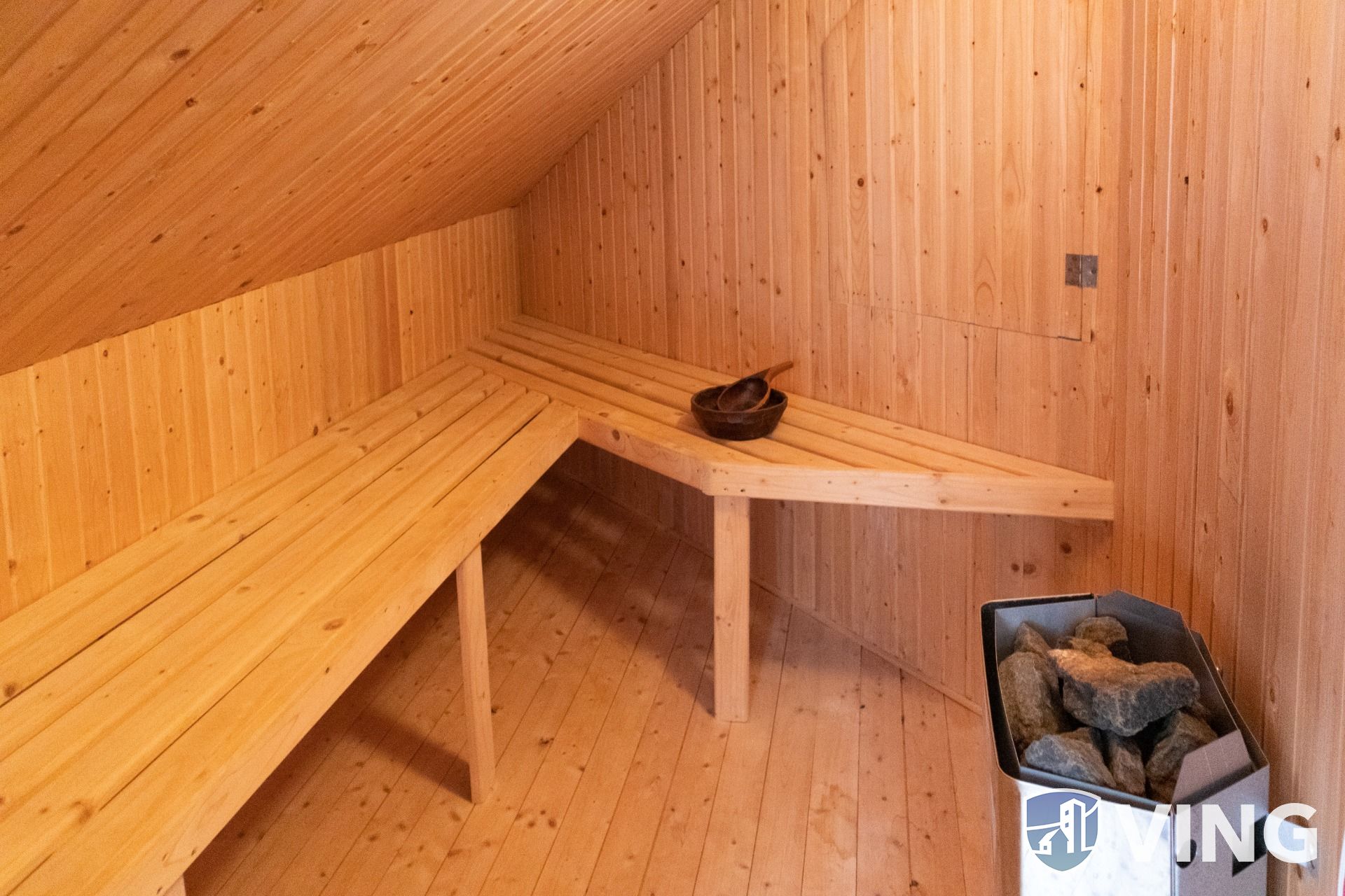 -164 m2, 1 living room + dining room, 1 kitchen, 6 rooms where 2 4-bed and 4 2-bed rooms can be constructed, 1 sauna, 2 bathrooms where one of them has a hydromassage shower cabin with a built-in radio + 2 toilets and 1 wardrobe room. In total, 16-18 people can be comfortably accommodated.