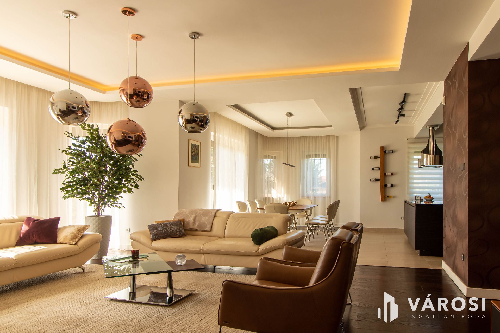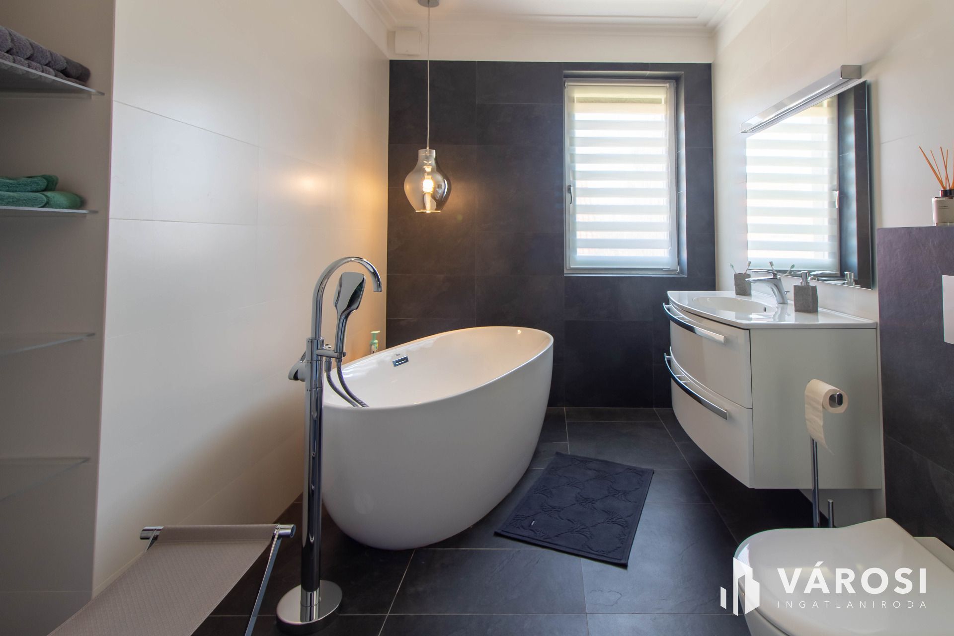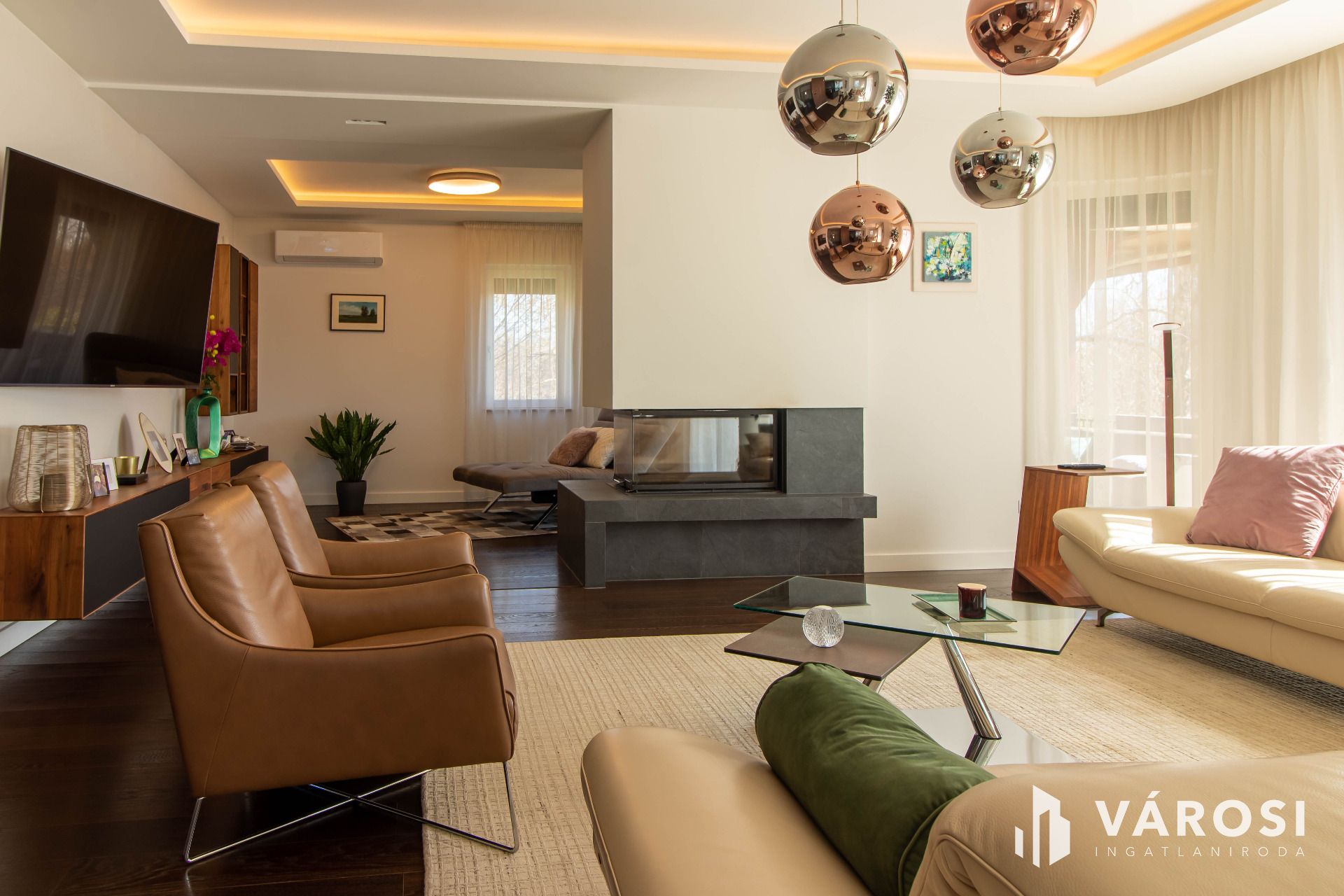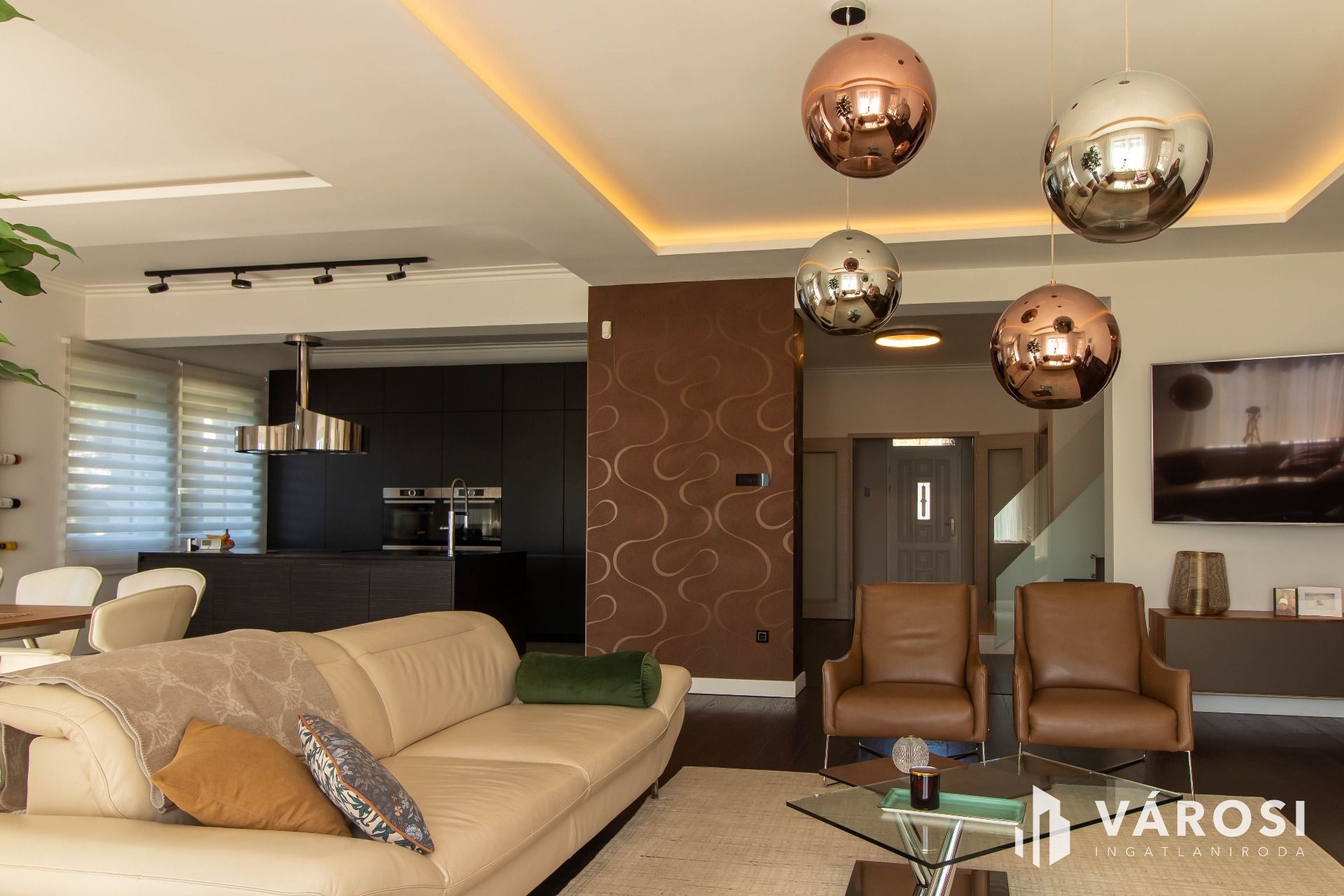 A ház teljes berendezéssel együtt is eladó akár, így a vevőnek semmire nincs gondja – az elegáns bútorok és dizájnelemek tökéletesen illeszkednek az enteriőrhöz.