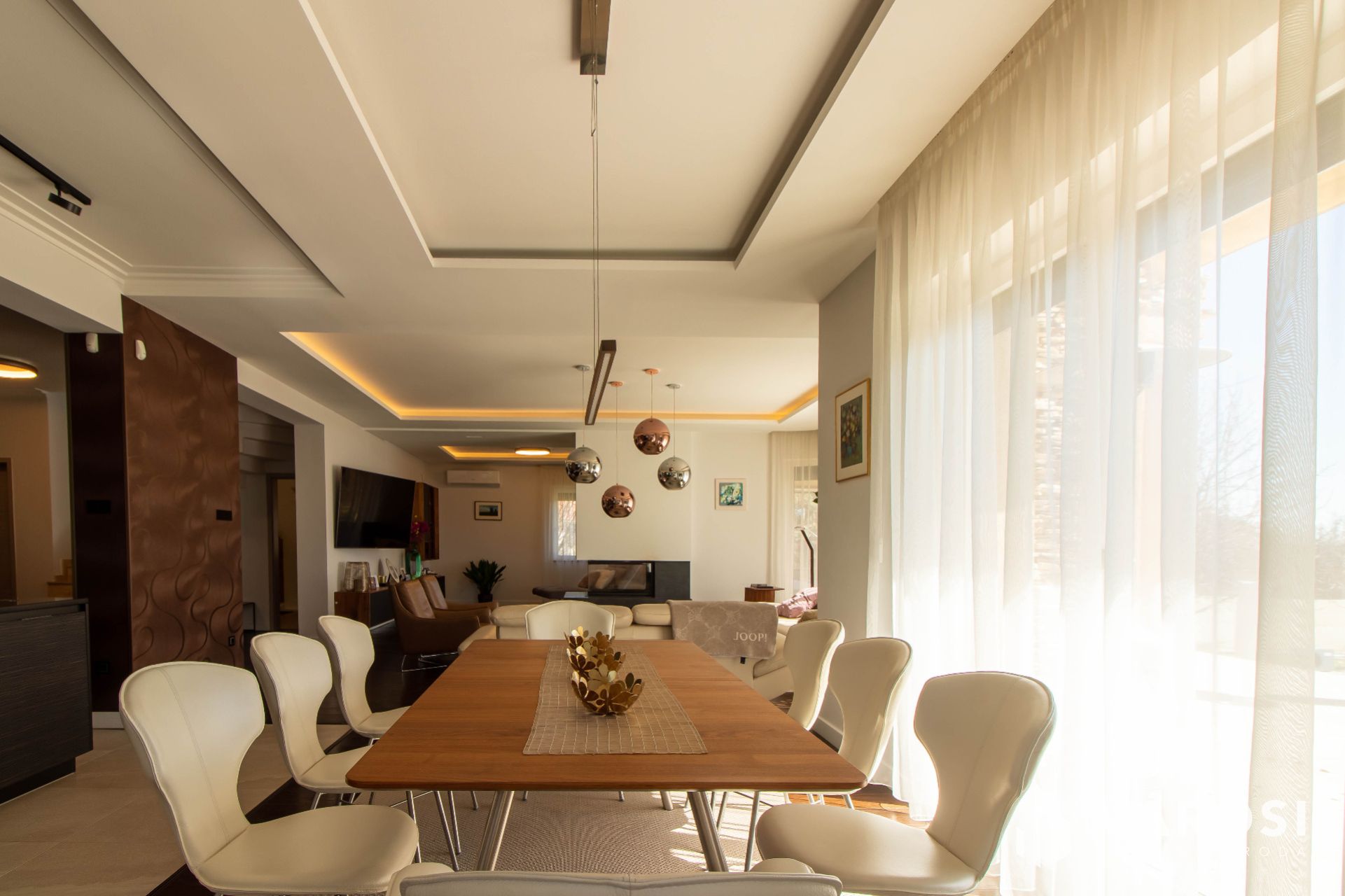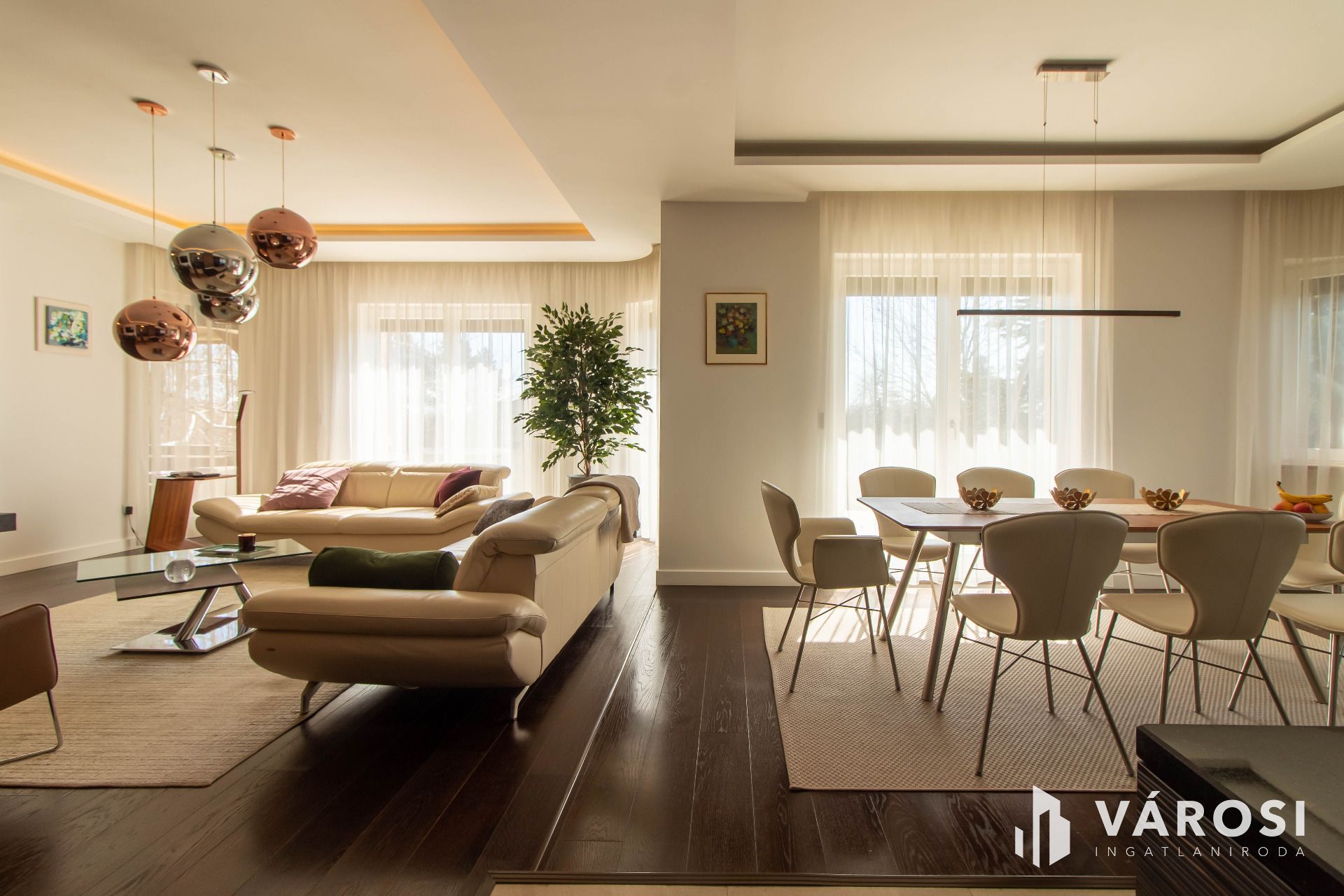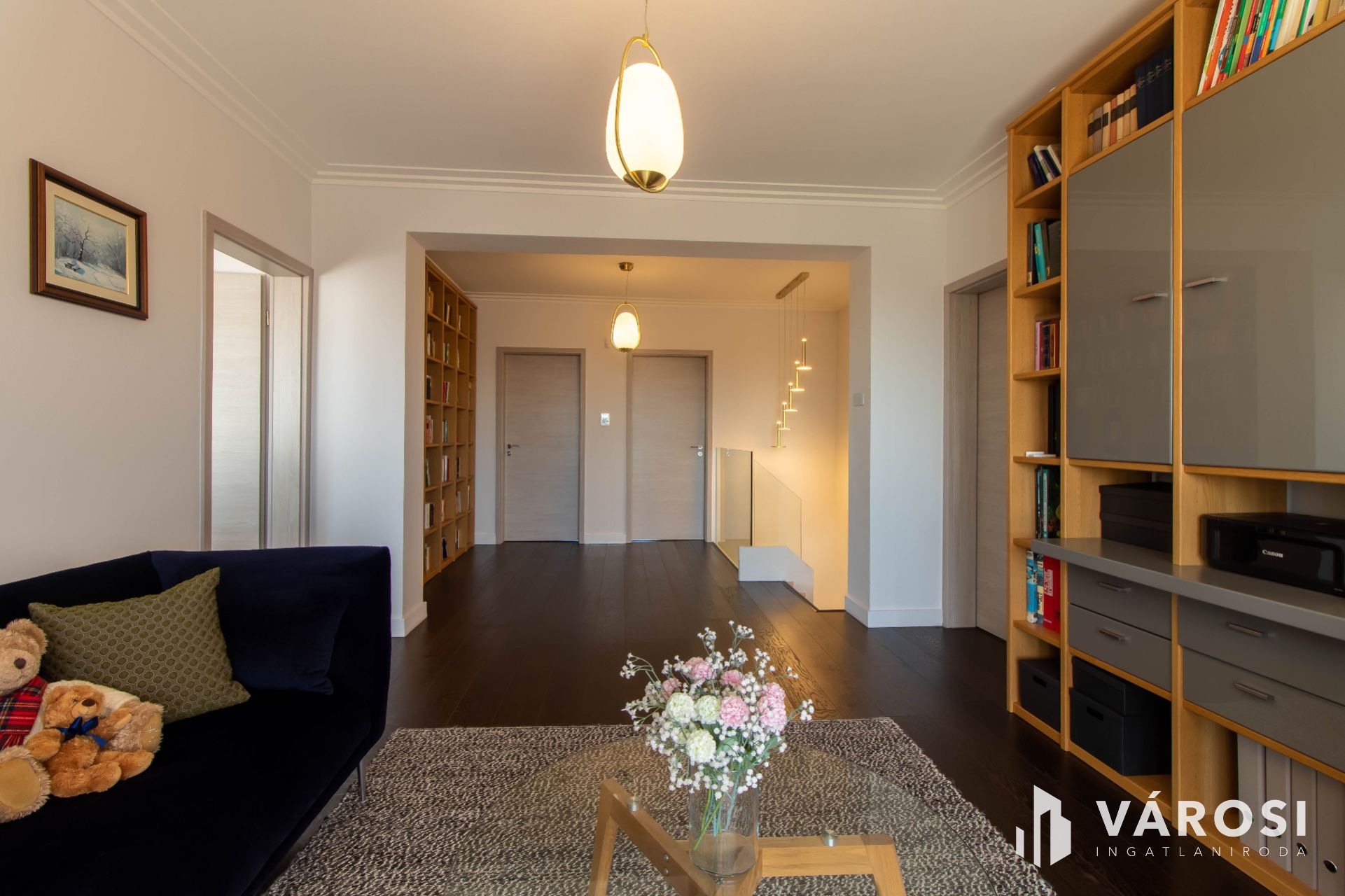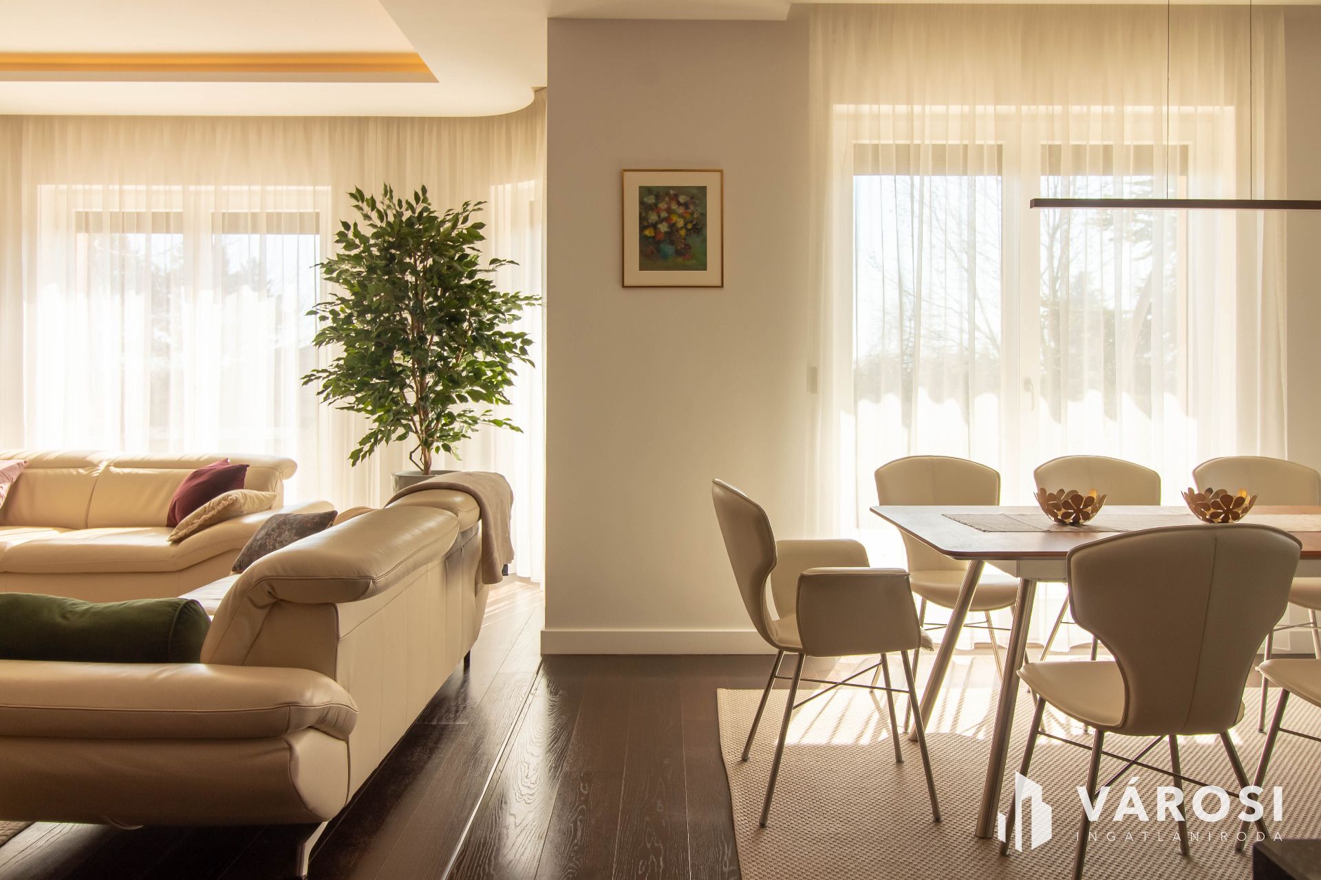 A ház teljes berendezéssel együtt is eladó akár, így a vevőnek semmire nincs gondja – az elegáns bútorok és dizájnelemek tökéletesen illeszkednek az enteriőrhöz.