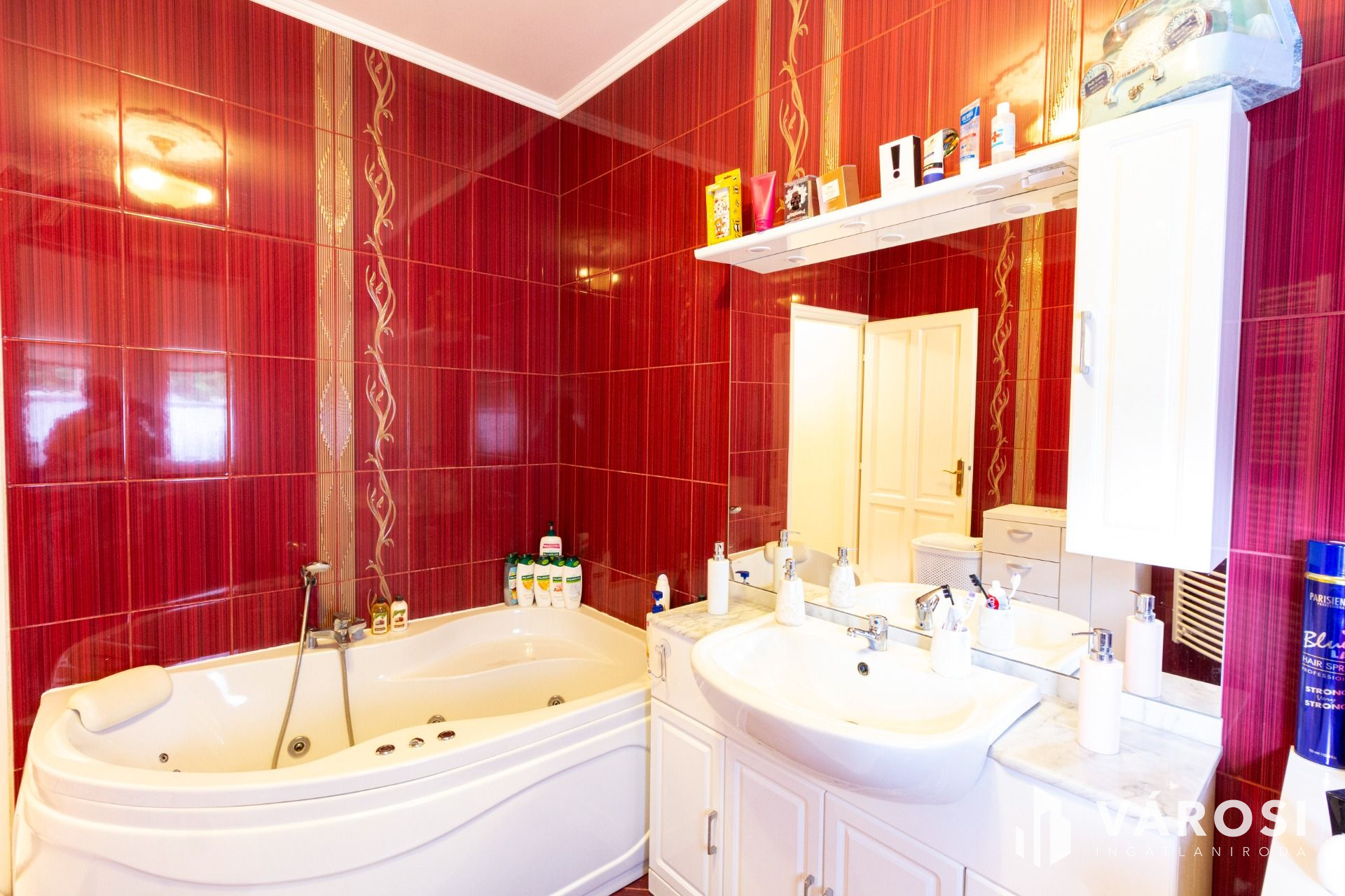 A fürdőszoba a 30 fúvókás jakuzzikáddal egyedi megoldású, de tusoló panel is rendelkezésre áll, valamint egy törölköző szárító is található a helyiségben.