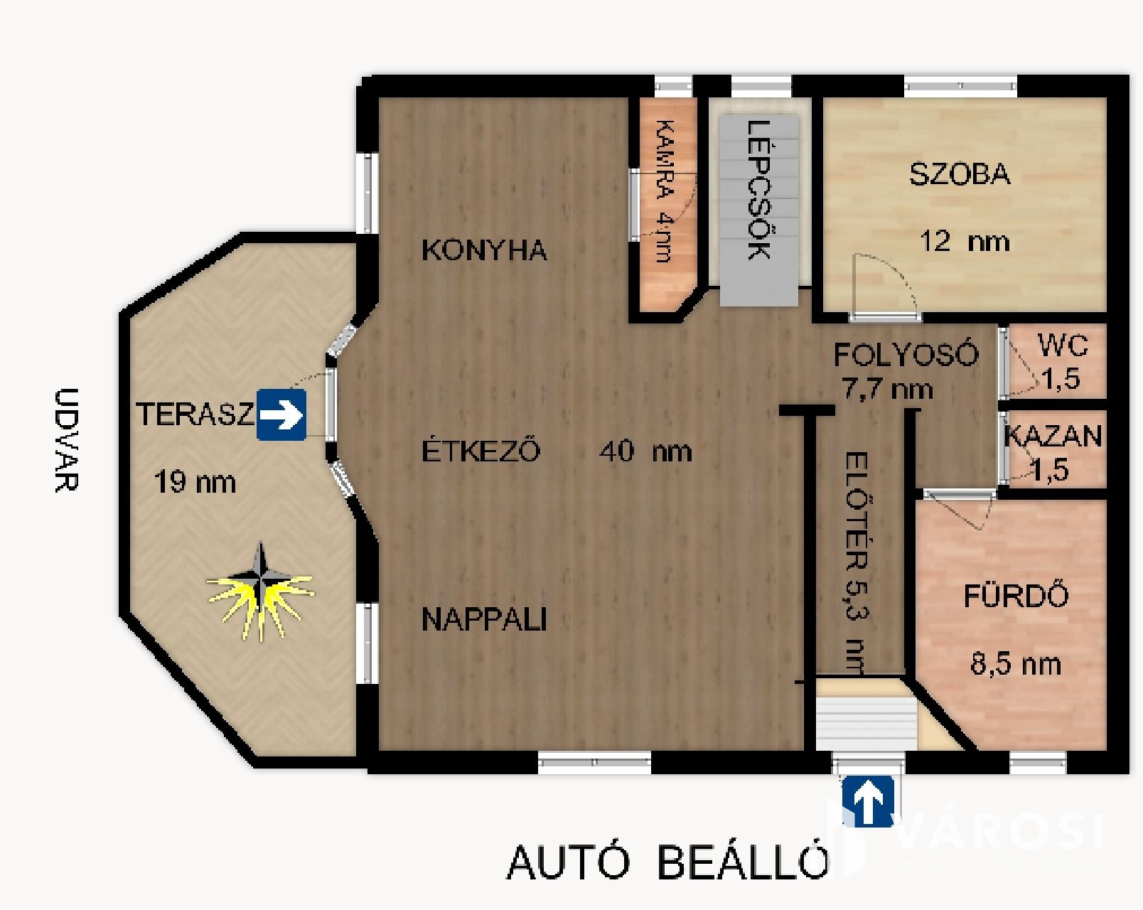 A házba belépve az előtérbe jutunk, innen nyílik balra a 40 nm-es nappali, a konyha, az ebédlő és a kamra, jobbra pedig a hálószoba, a fürdő és a külön WC, valamint az emeletre vezető lépcsősor is.