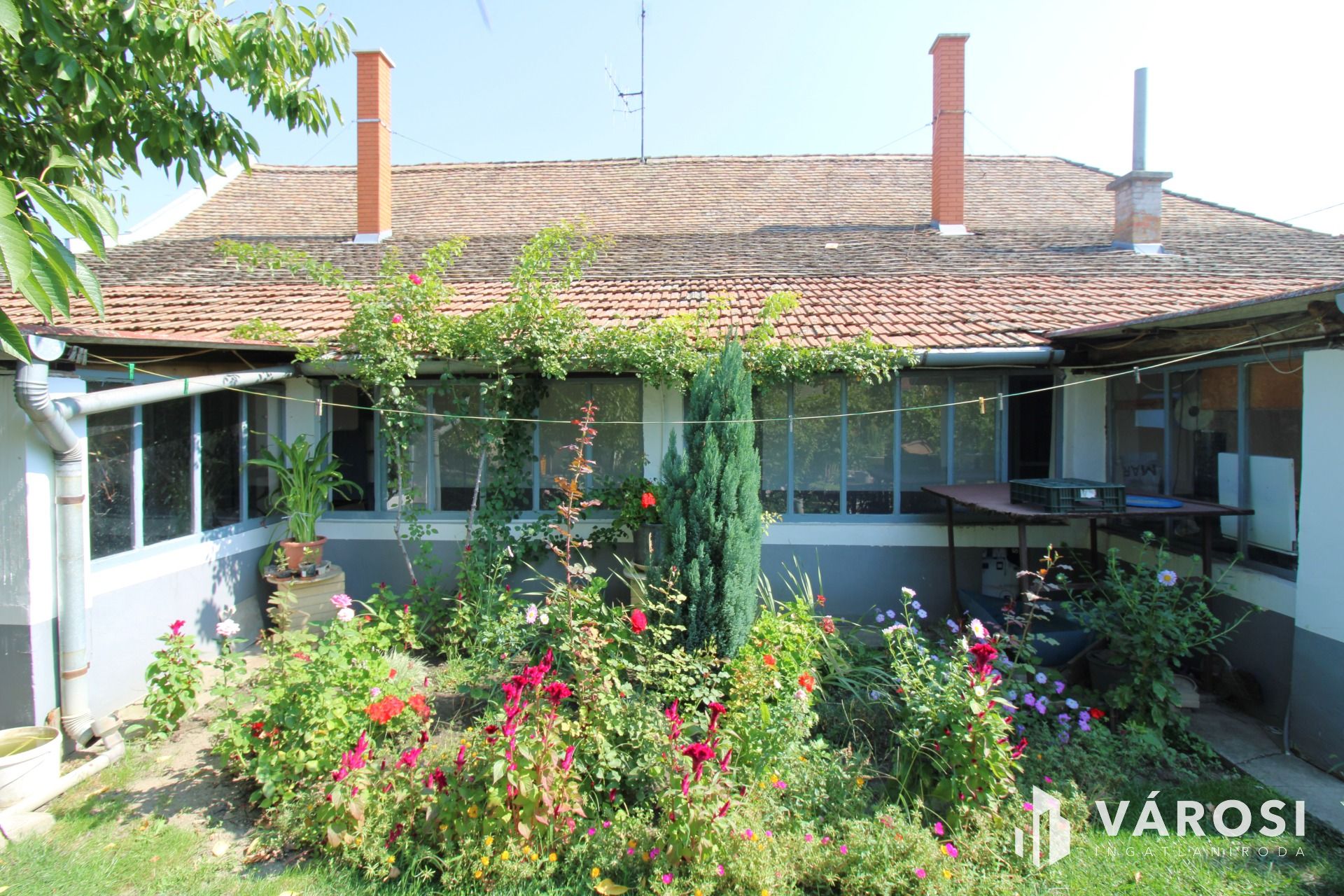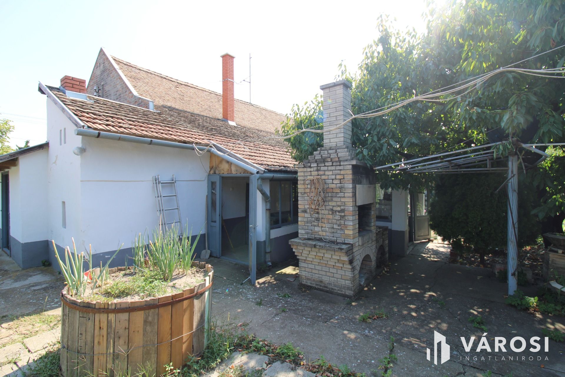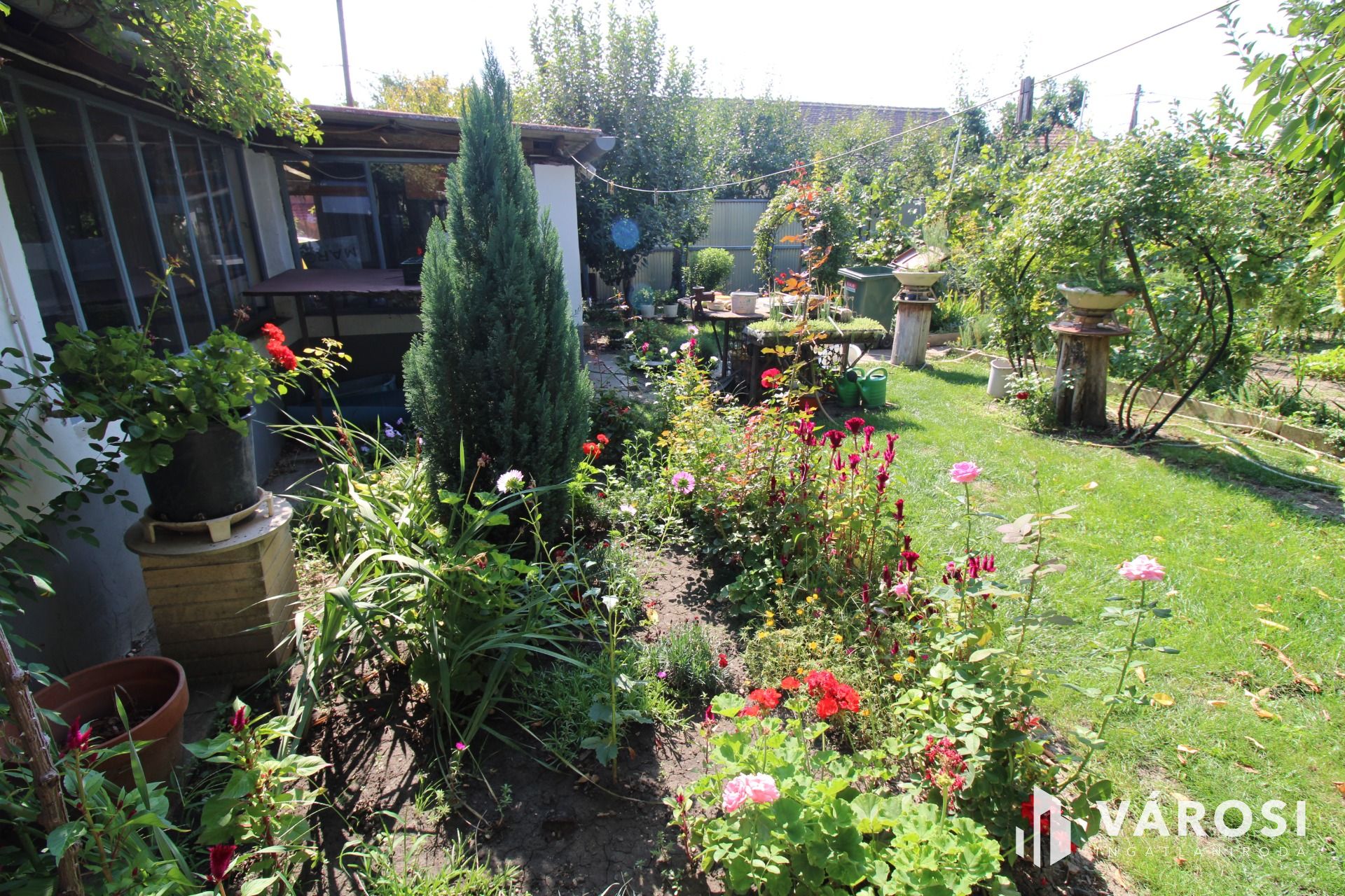A tetőszerkezet jó állapotú, a kertben fúrtkút biztosítja locsoláshoz szükséges vízmennyiséget.