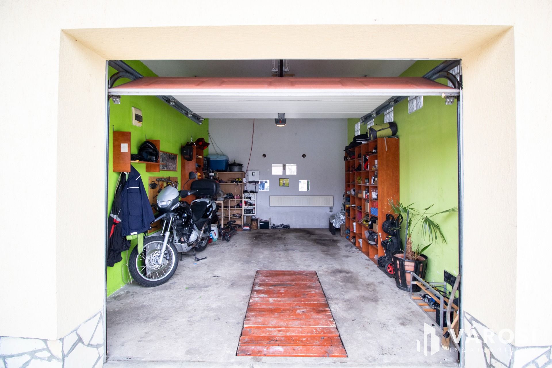 Az utcafront felől közvetlenül megközelíthető, elektromos kapuval ellátott garázs már önmagában is külön kategória: fűtött, szerelőaknás, kézmosóval felszerelt. A ház külső megjelenése igényes és időtálló: kovácsoltvas kerítés, terméskő lábazat mészkőből, nemesvakolt homlokzat, gondozott kert.