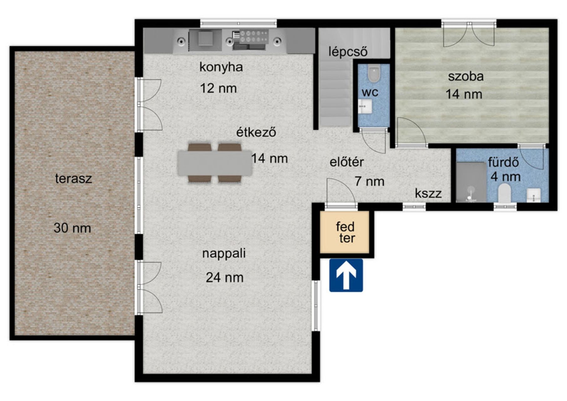 - Amerikai-konyhás nappali, 4. hálószoba, 2. fürdőszoba, WC, háztartási helyiség, hatalmas terasz.