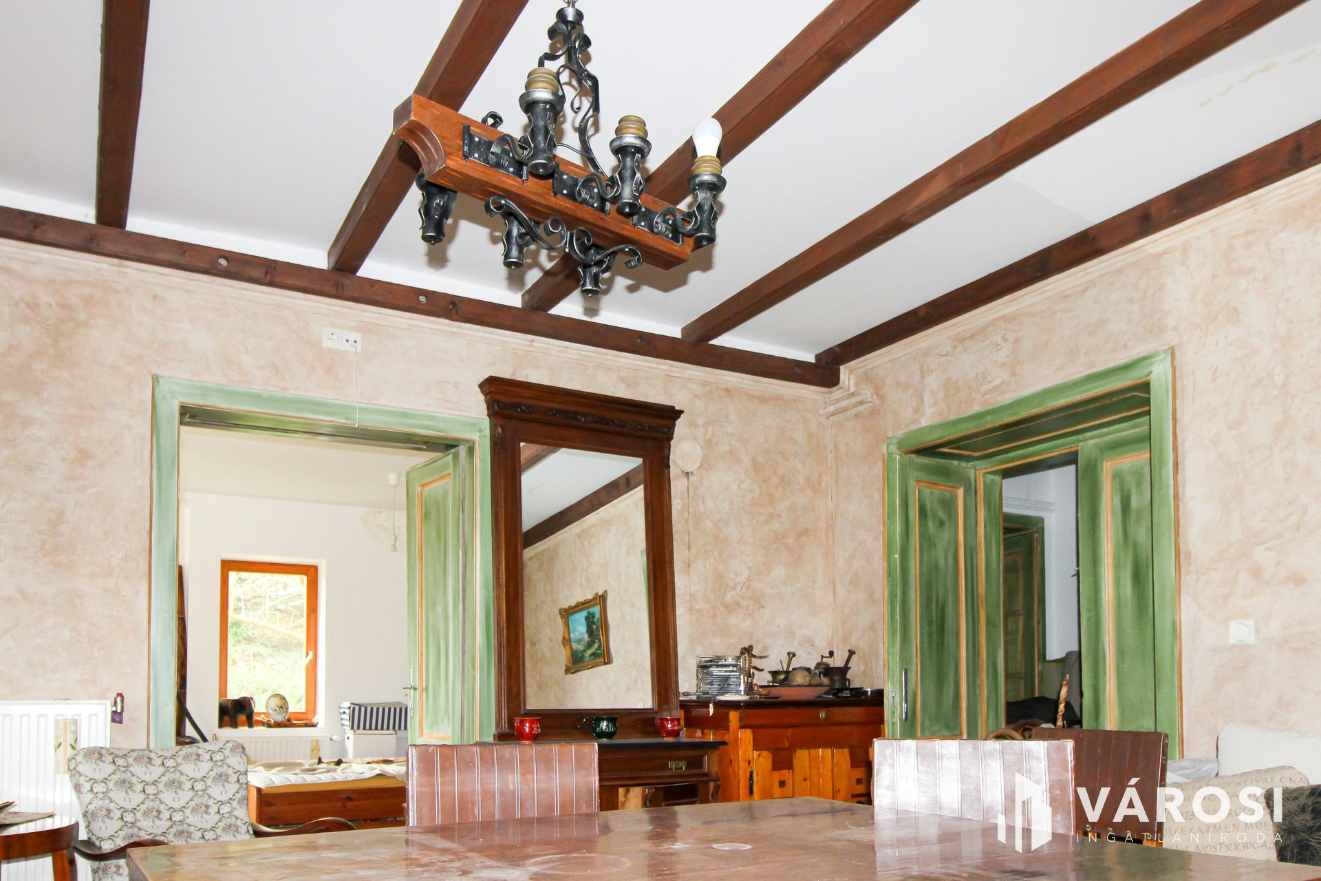 Az igazán egyedi hangulatú kialakítással rendelkező családi otthon, átlagos állapotú, kényelmes terek és kellemes, nyugodt környezet jellemzi. A nagy méretű telken egy gépkocsi tárolására alkalmas zárt garázs , illetve két gépkocsi beállására alkalmas fedett garázs, továbbá egy pince, ásott kút, és egy melléképület helyezkedik.