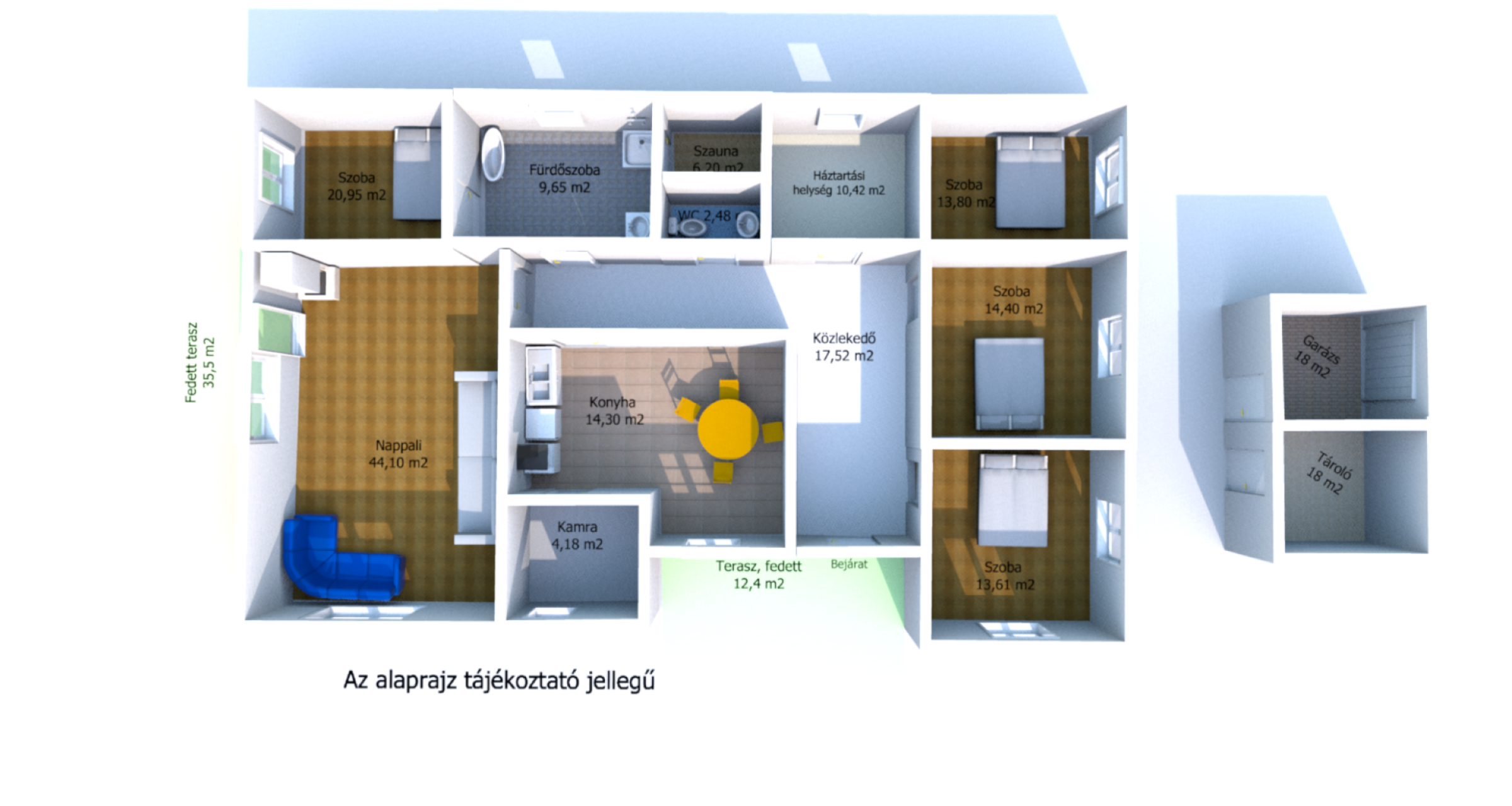 • Szobák és funkciók: négy külön nyíló, teljes értékű hálószoba biztosítja a család minden tagjának a privát szférát. A konyhához praktikus kamra, a házhoz pedig külön háztartási helyiség tartozik.